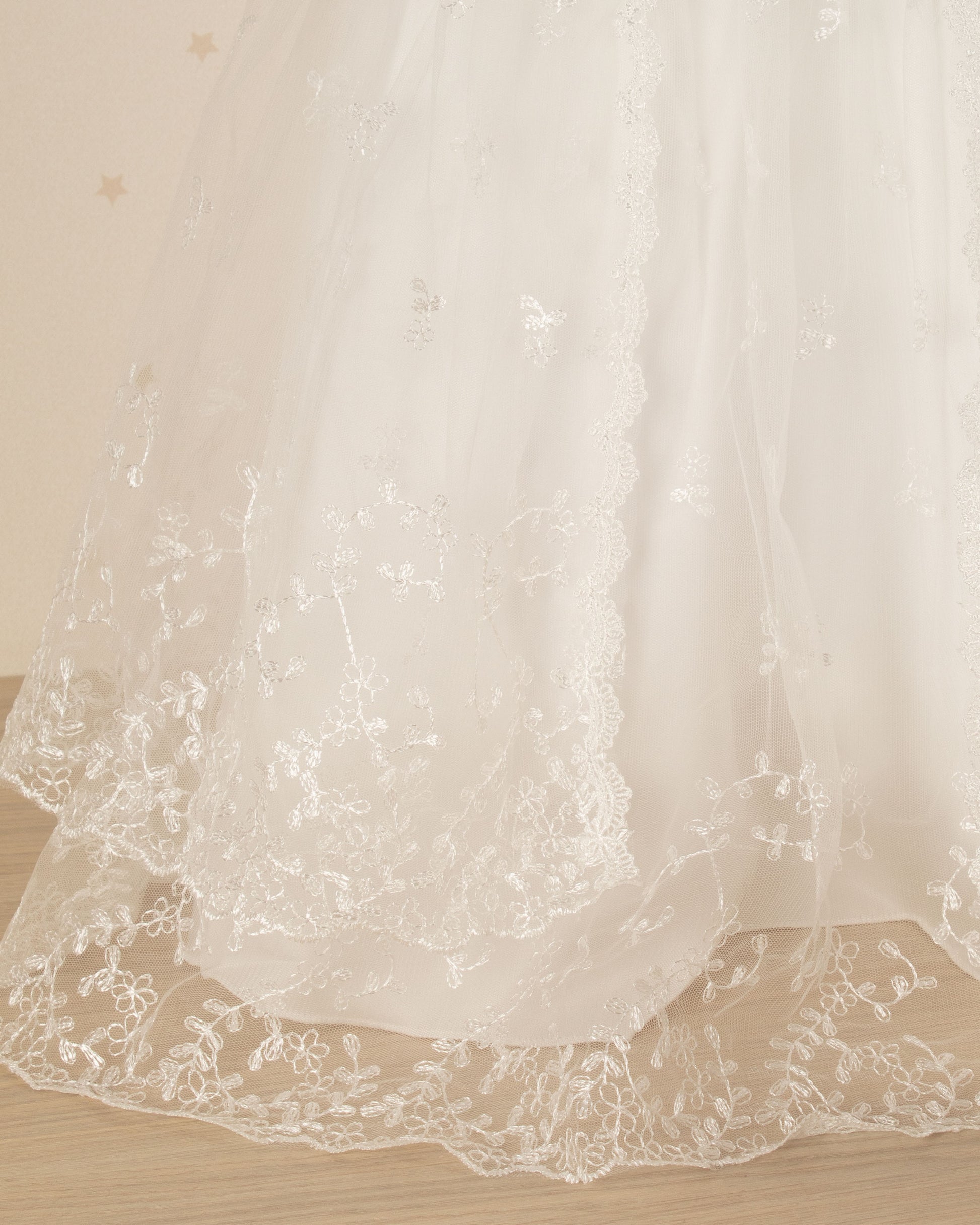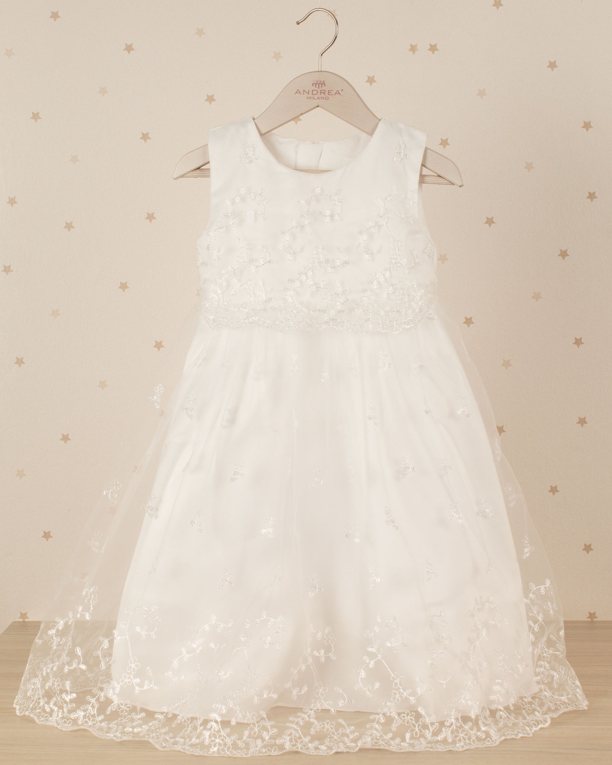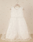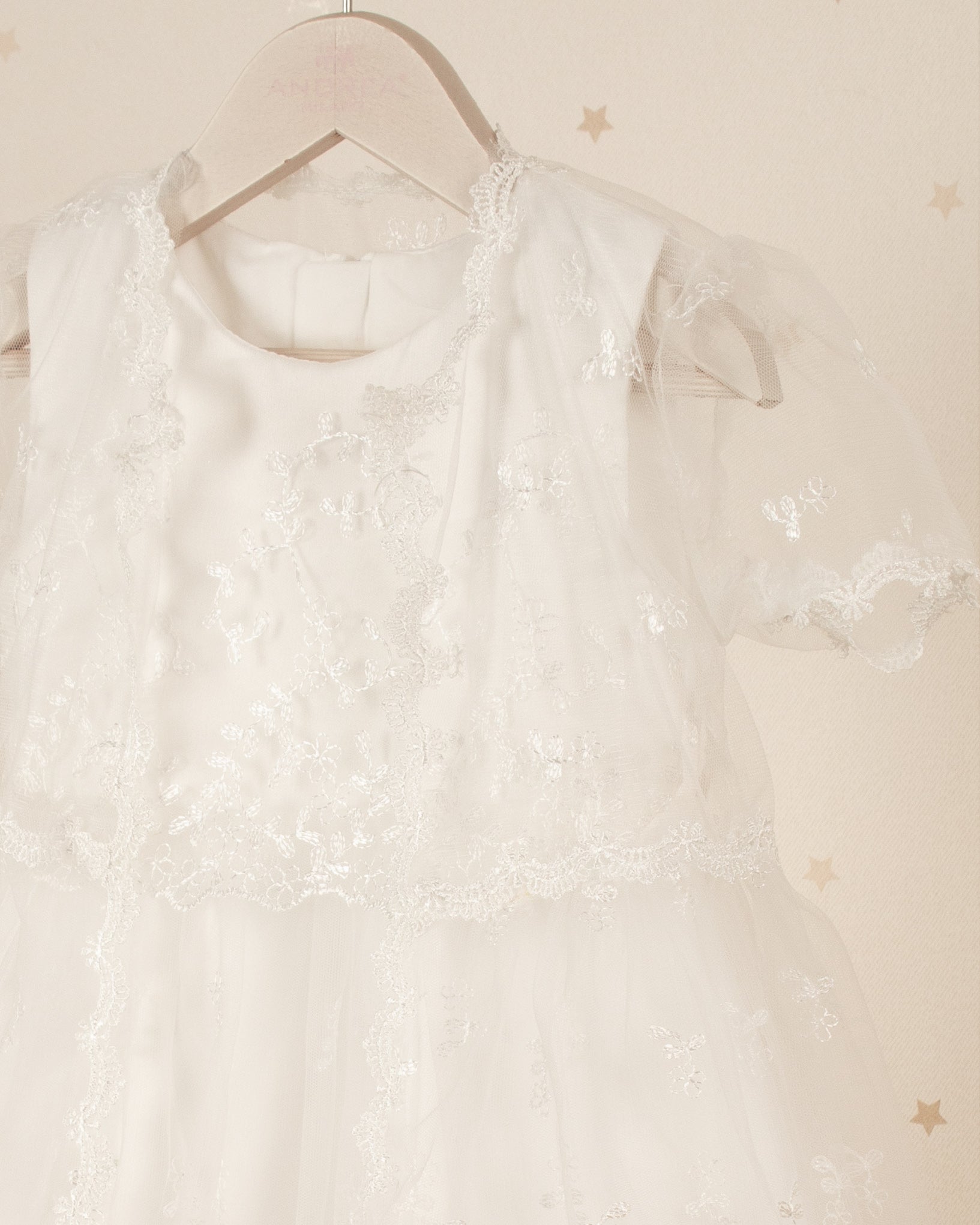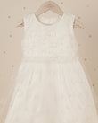 Elegancia en cada puntada. Este vestido de ceremonia se distingue por su caída impecable y detalles en encaje que evocan tradición y ternura. Su capa eleva el look añadiendo un toque sofisticado.