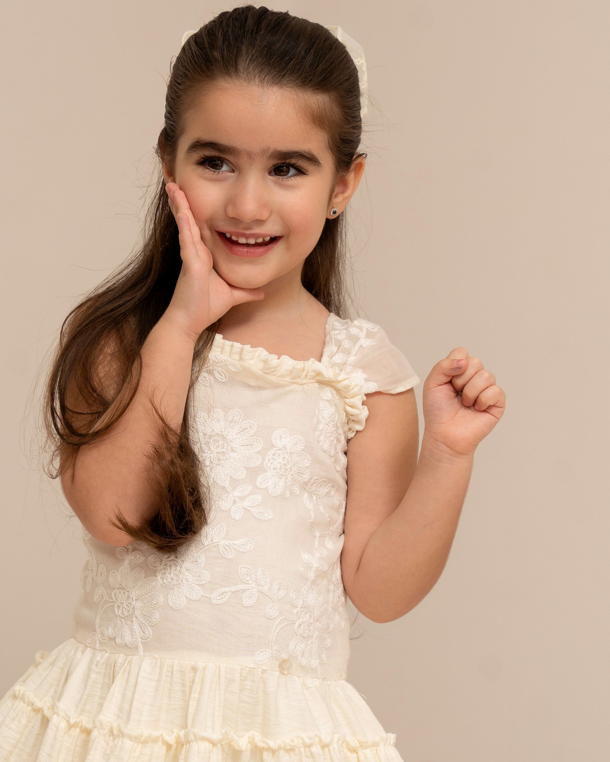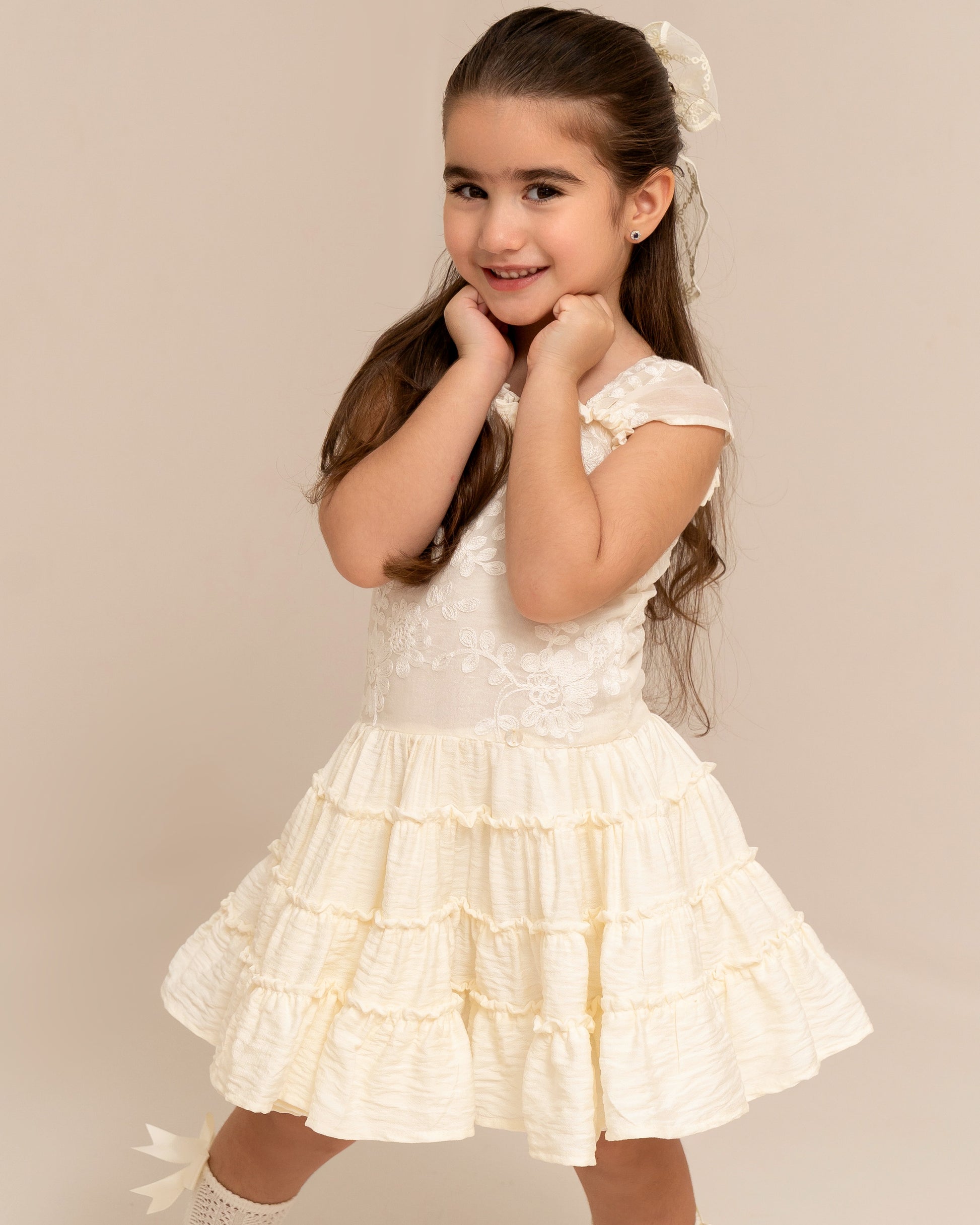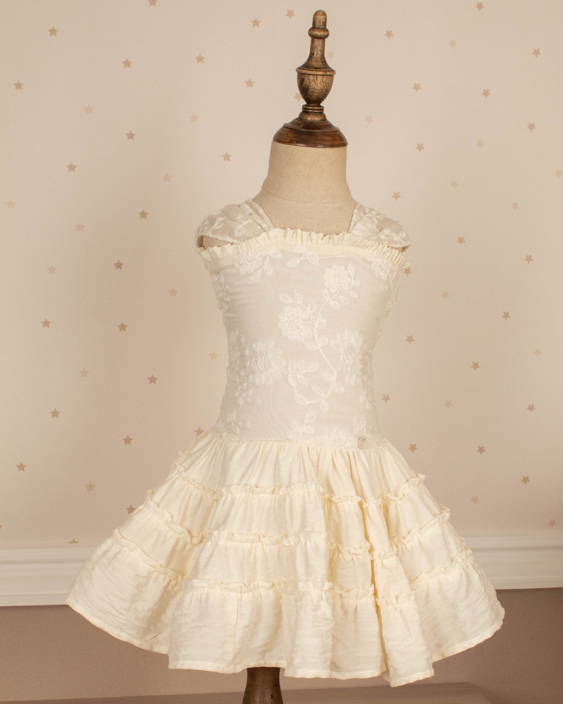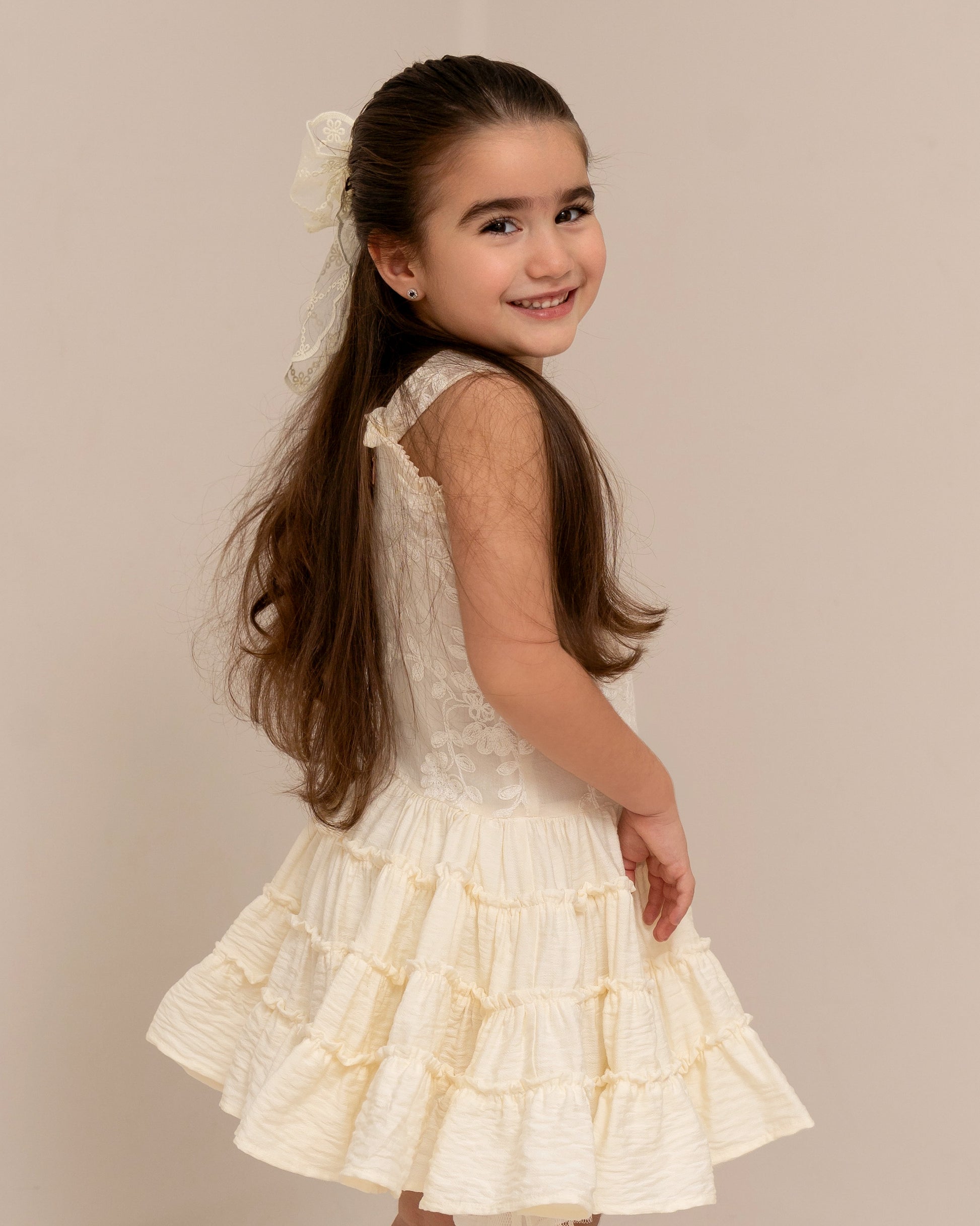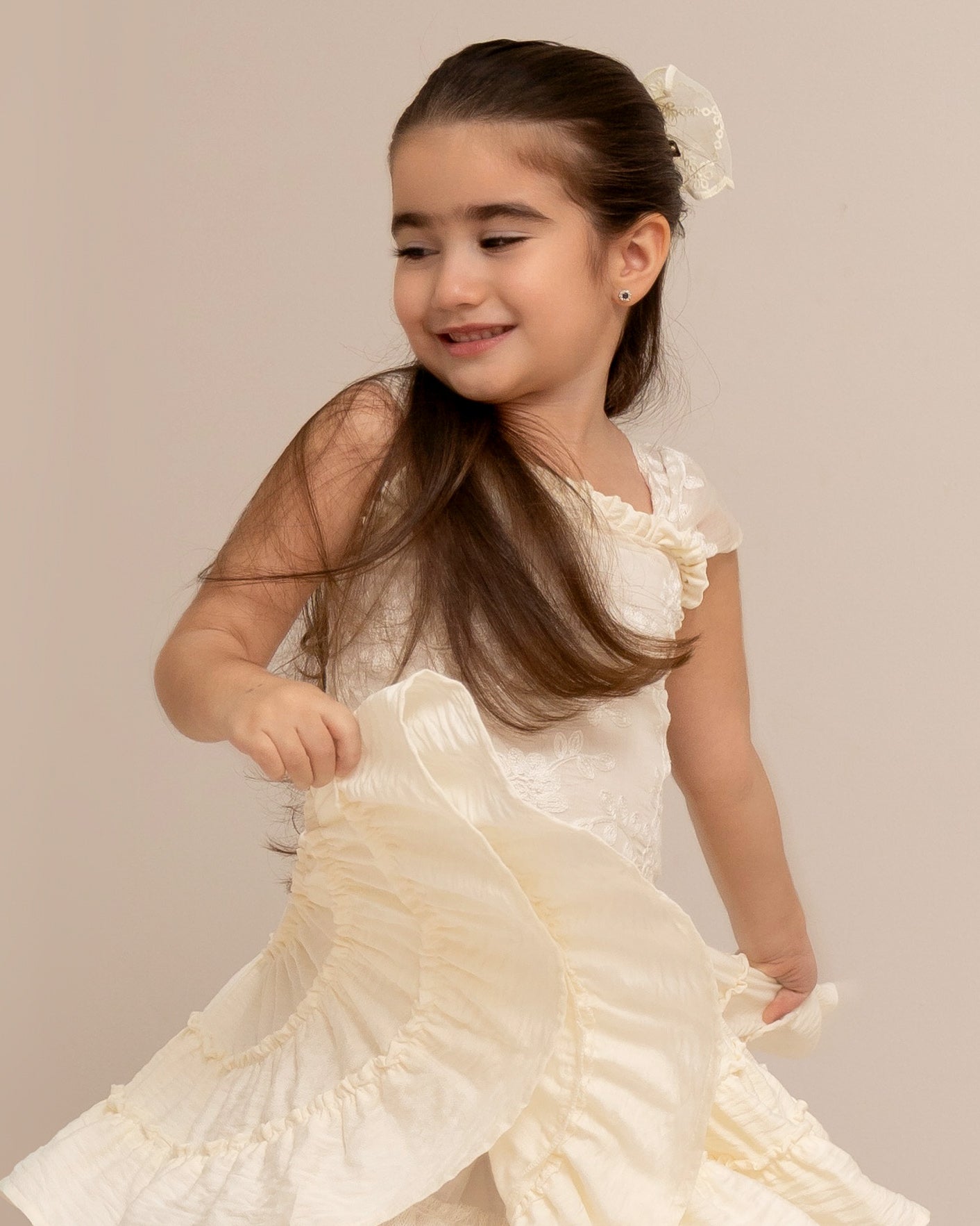 Silueta con vuelo amplio que crea un efecto espectacular al caminar. Modelo de 4 años usando talla 4.