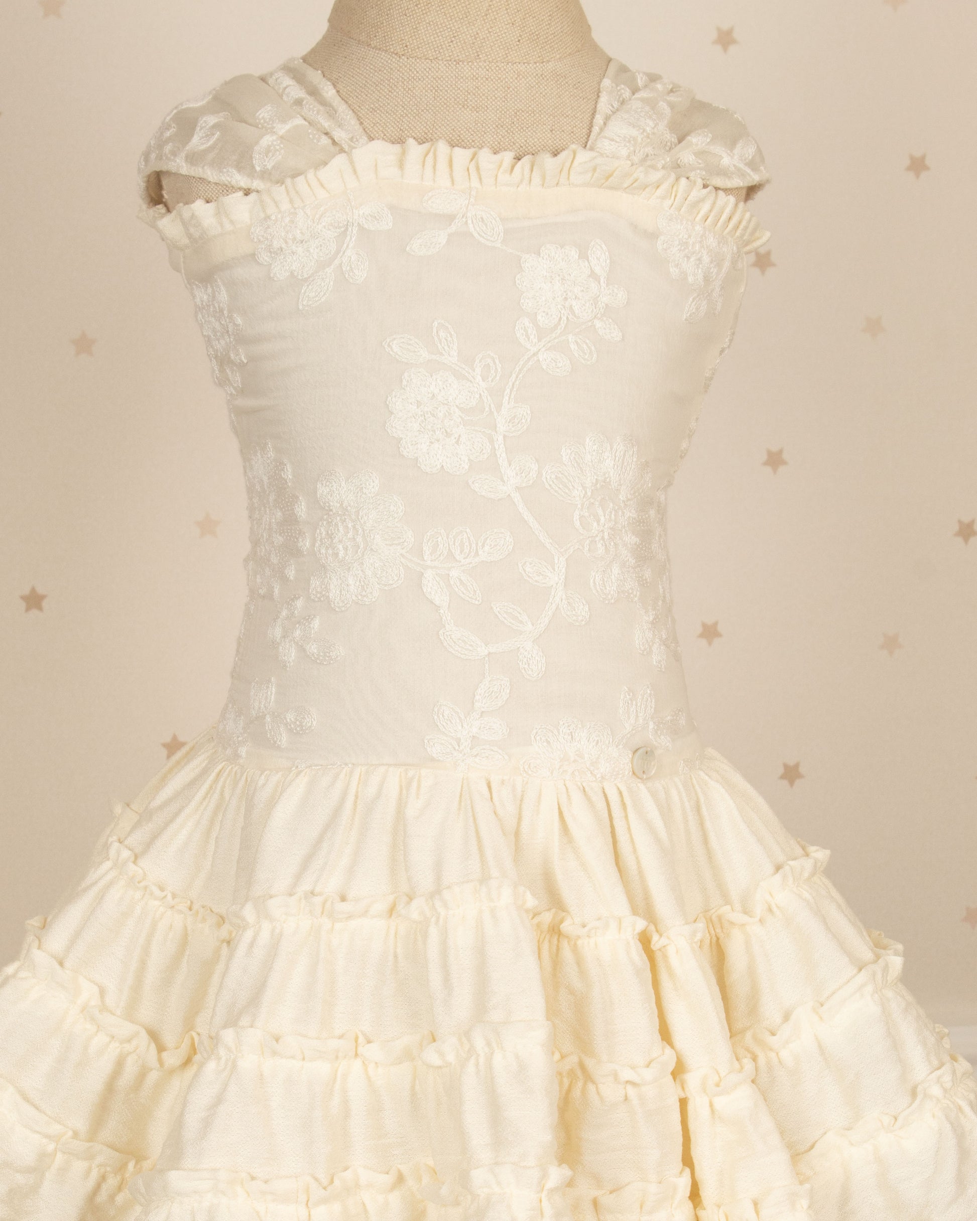 El vestido Promesa de Andrea Milano es una pieza ceremonial diseñada para momentos verdaderamente especiales. Confeccionado completamente en tono ivory, su silueta se distingue por un vuelo amplio y elegante que aporta movimiento y presencia, mientras sus delicados detalles realzan la estética romántica y atemporal de la prenda.
